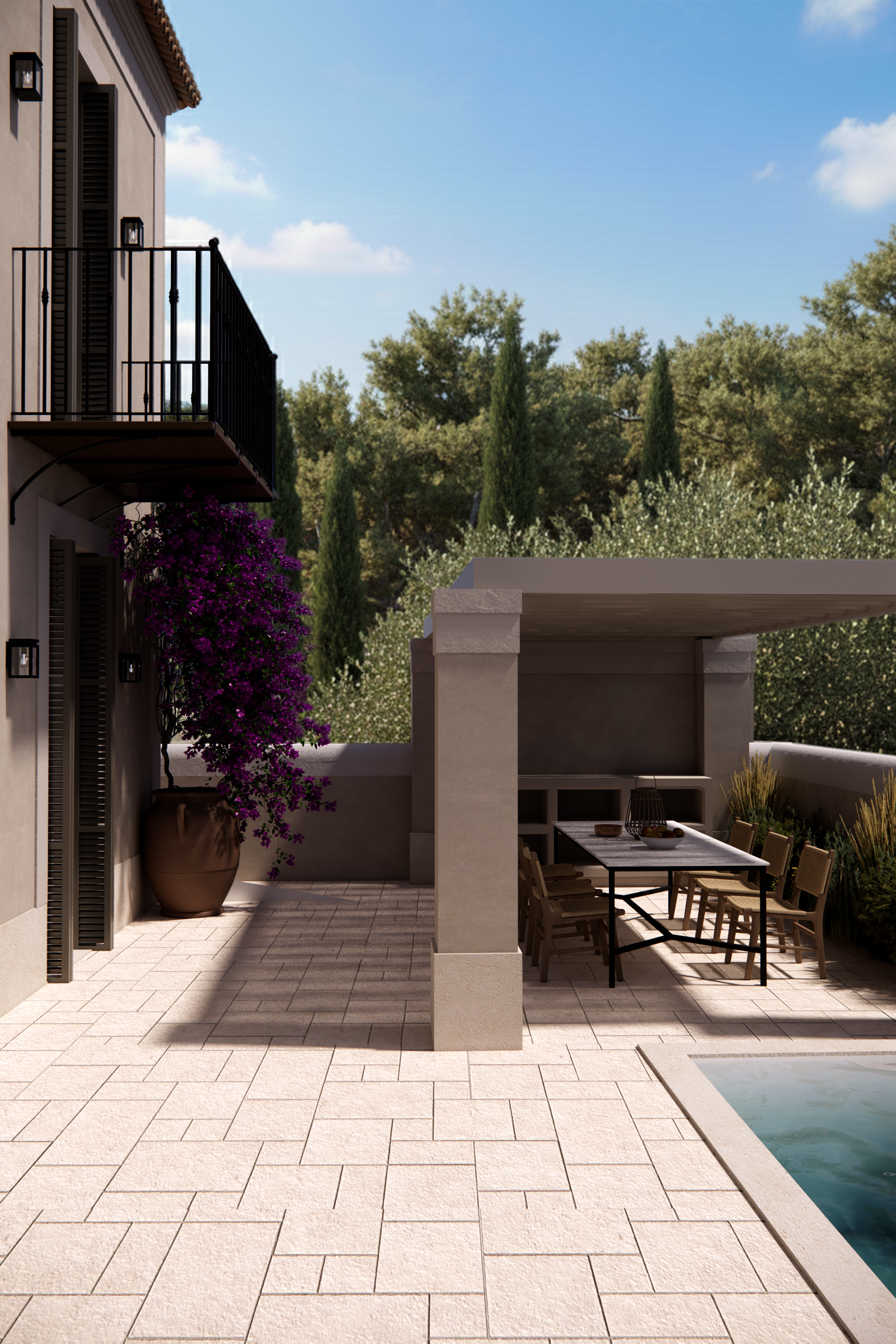 The villa comprises of a living area, kitchen and dining area, master bedroom and two guestrooms spanning two floors. Our vision is to create a house with a timeless character that combines past and future, natural materials, minimal elements and bold colors in details.